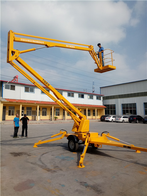 四川客戶來驗(yàn)收的這臺(tái)拖車折臂式液壓升降平臺(tái),升高14米,載重260公斤,最大延伸工作距離2-8米,它的動(dòng)力電源可采用柴油機(jī),電瓶,及汽油機(jī).