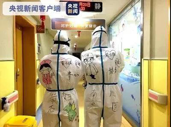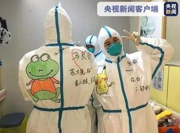 一幅幅充滿童趣的圖案,承載著醫(yī)護人員的愛心,沖淡了疫情給帶給孩子們的心理壓力,防護服隔離了病毒,卻沒有隔離愛。