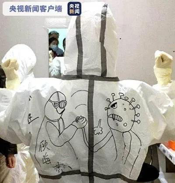 為消除孩子們的恐懼,護士在防護服上畫畫,這是江蘇支援黃石醫(yī)療隊隊員,南京市兒童醫(yī)院護士馬良超,進(jìn)入隔離區(qū)前拍攝的照片。
